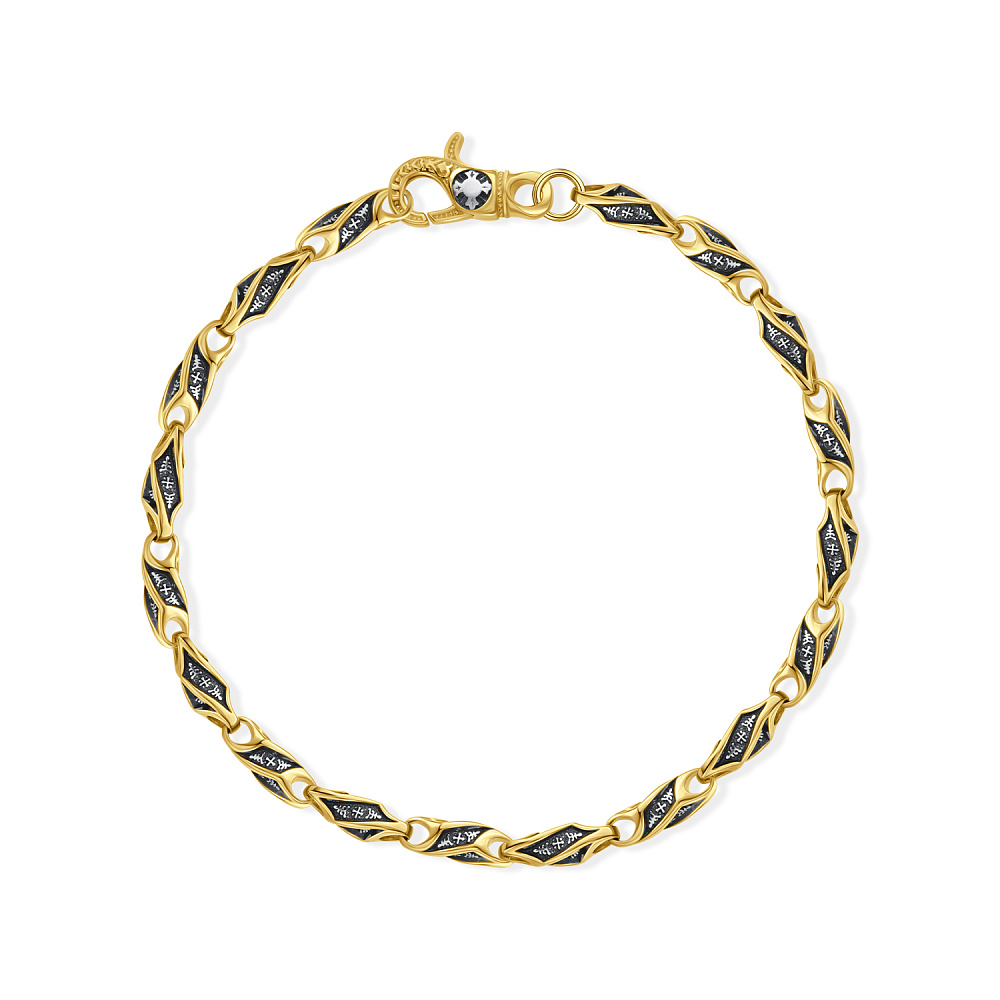 Продолговатые изогнутые звенья браслета будут свободно скользить по руке при любом движении, придавая изящность вашему запястью. В середине каждого звена расположен миниатюрный крест в окружении тонкого флорального рисунка.