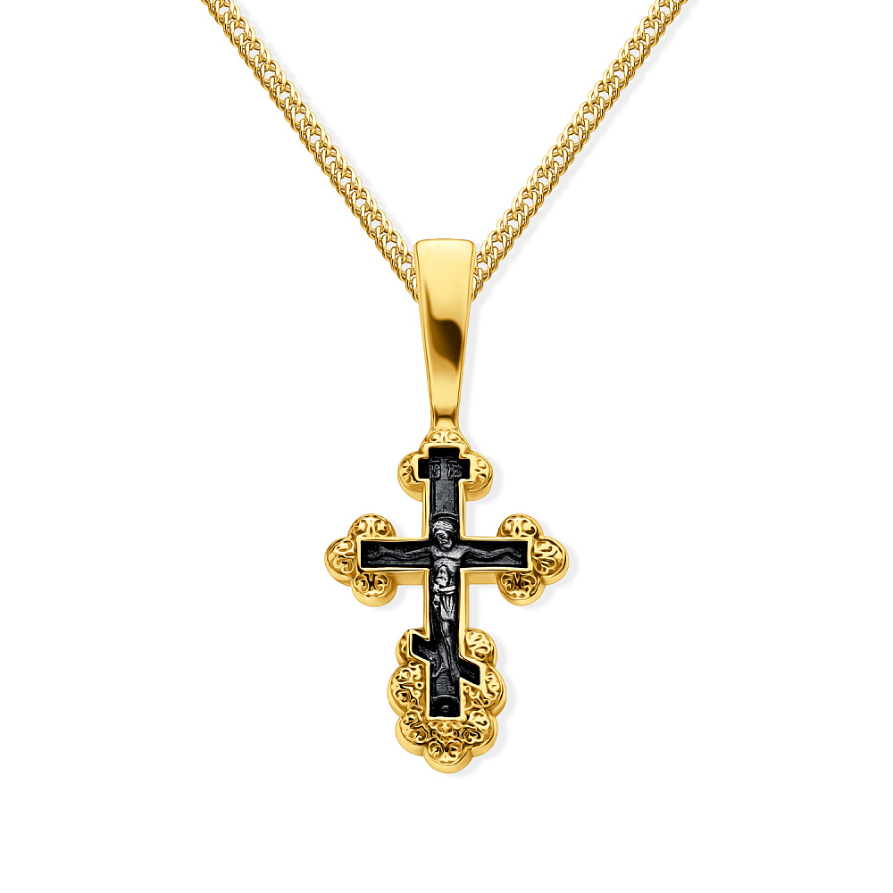 Небольшой нательный крест выполнен в традиционной форме процветшего креста. Распятие Господа Иисуса Христа окружено орнаментом в виде сердец, внутри которых помещены условно изображенные цветы лилии.