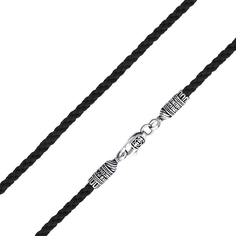 Шнурок выполнен из полиэфирного шелка-полиэстера, что придает прочность и высокую износостойкость изделию. Украшение имеет несколько вариантов размера. Застежка выполнена из серебра 925 пробы с чернением.
