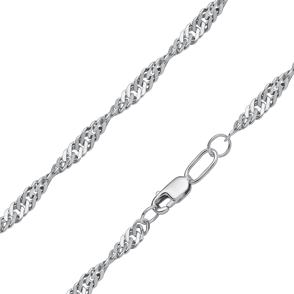 Плетение “Сингапур” сочетается с любыми подвесками, поэтому легко впишется в любой ваш стиль. Красивый холодный блеск звеньев за счет покрытия родием не оставит украшение незамеченным. А удобный замок-карабин обеспечит легкое и безопасное крепление аксессуара на шее.